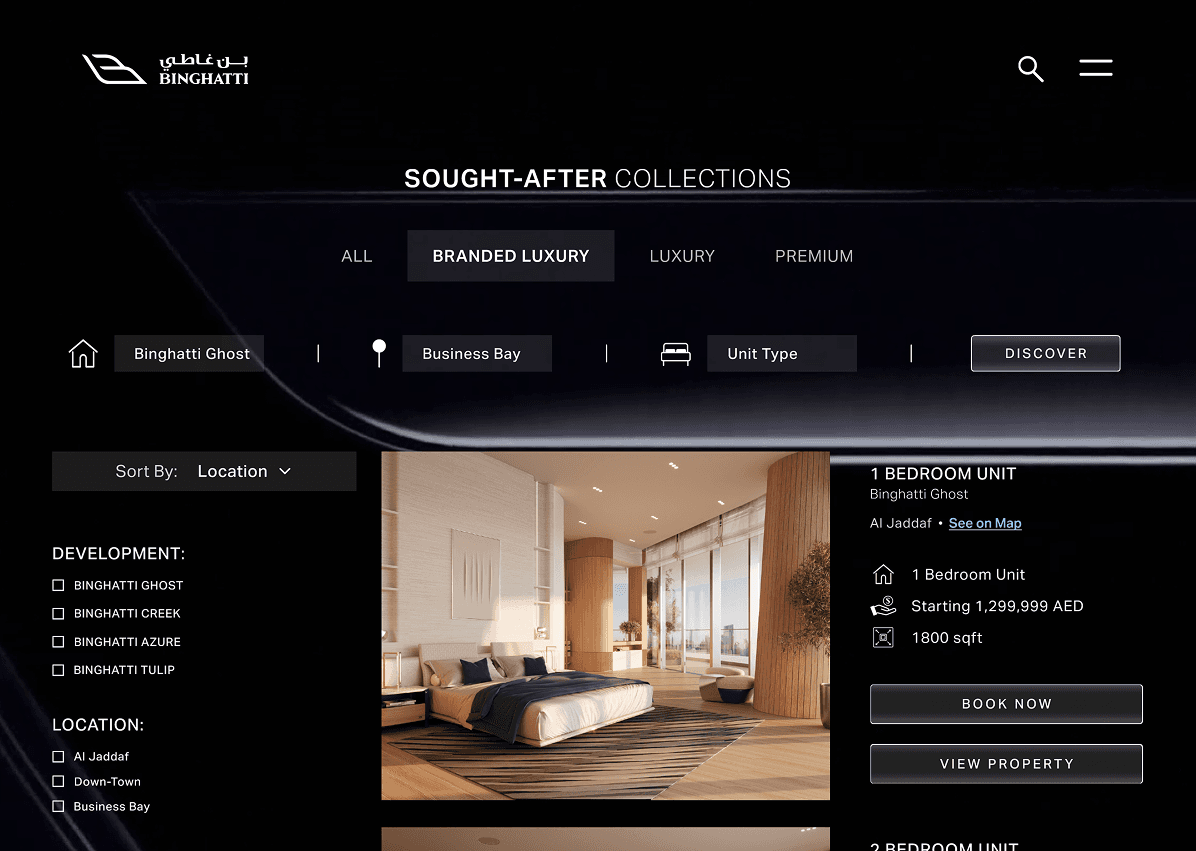 Designed a fully responsive website for the esteemed real estate brand "Binghatti" for their billion dollar business. The project involved creating a strong brand identity and designing visually striking graphics to showcase the finest craftsmanship and architecture.